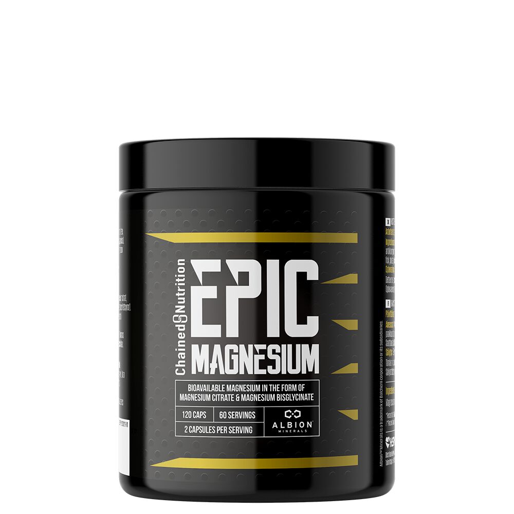 Epic Magnesium från Chained Nutrition är ett kosttillskott med två lättupptagliga former av magnesium: magnesiumcitrat och magnesiumbisglycinat.