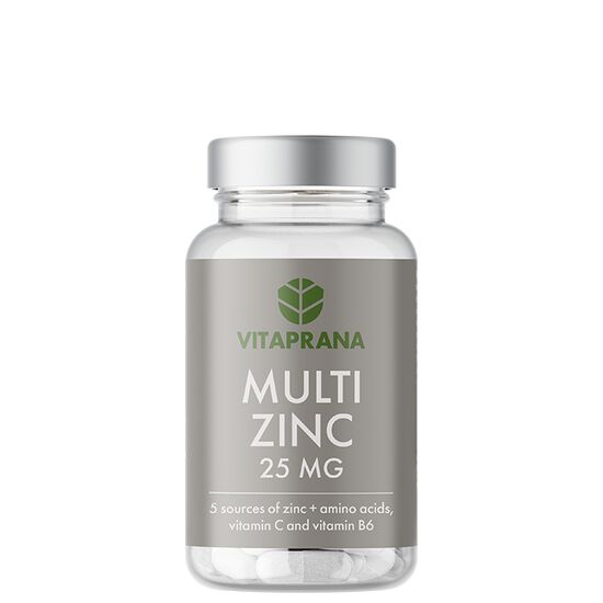 Multi Zinc från Vitaprana är ett kosttillskott som kombinerar fem olika former av zink tillsammans med vitamin C, vitamin B6 och fria aminosyror.